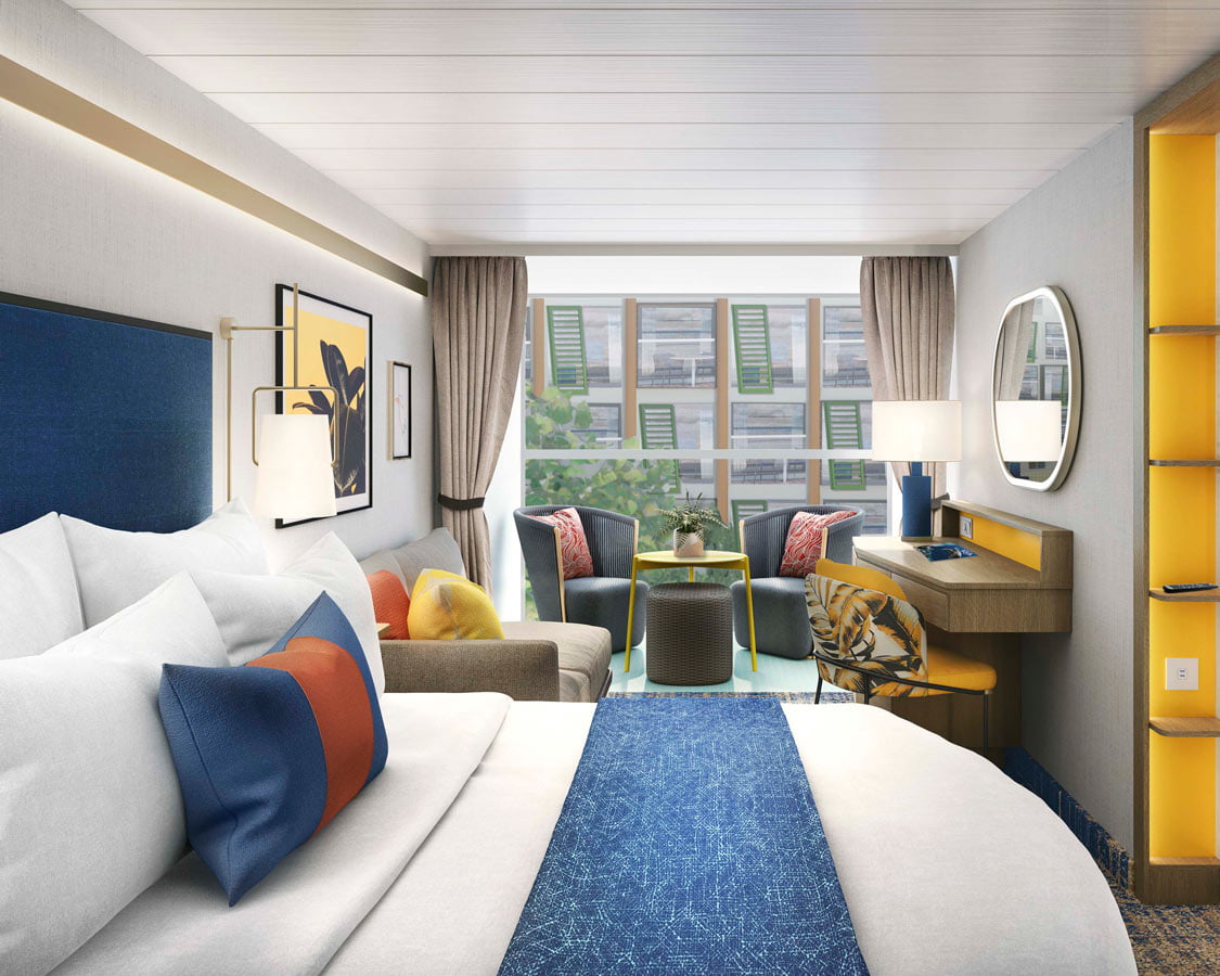 Cabinele și suitele sunt foarte variate, de la cabina interioară la suite spațioase cu vedere panoramică și balcon. Printre opțiuni se numără: • Infinite Balcony – cabine cu balcon „francez” cu geamuri panoramice. • Surfside Family Suite și Ultimate Family Townhouse – soluții moderne pentru familii, cu spații separate pentru copii și facilități tematice. • Icon Loft Suite și alte suite premium cu terase spațioase.