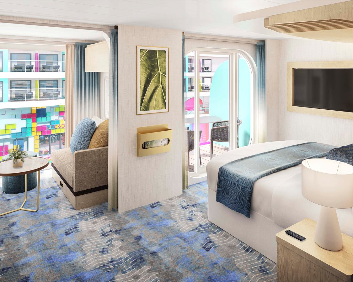 Cabinele și suitele sunt foarte variate, de la cabina interioară la suite spațioase cu vedere panoramică și balcon. Printre opțiuni se numără: • Infinite Balcony – cabine cu balcon „francez” cu geamuri panoramice. • Surfside Family Suite și Ultimate Family Townhouse – soluții moderne pentru familii, cu spații separate pentru copii și facilități tematice. • Icon Loft Suite și alte suite premium cu terase spațioase.