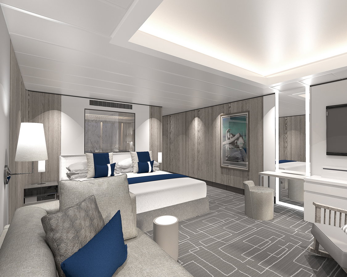 • Infinite Veranda : cabine unde balconul și camera devin un singur spațiu panoramic, cu ferestre mari spre mare. • AquaClass® & Concierge Class : cabine cu facilități extra și acces la restaurante exclusive. • Suite & Iconic Suites : suite spațioase cu vedere panoramică și servicii premium, inclusiv în unele cazuri butler și facilități de top.