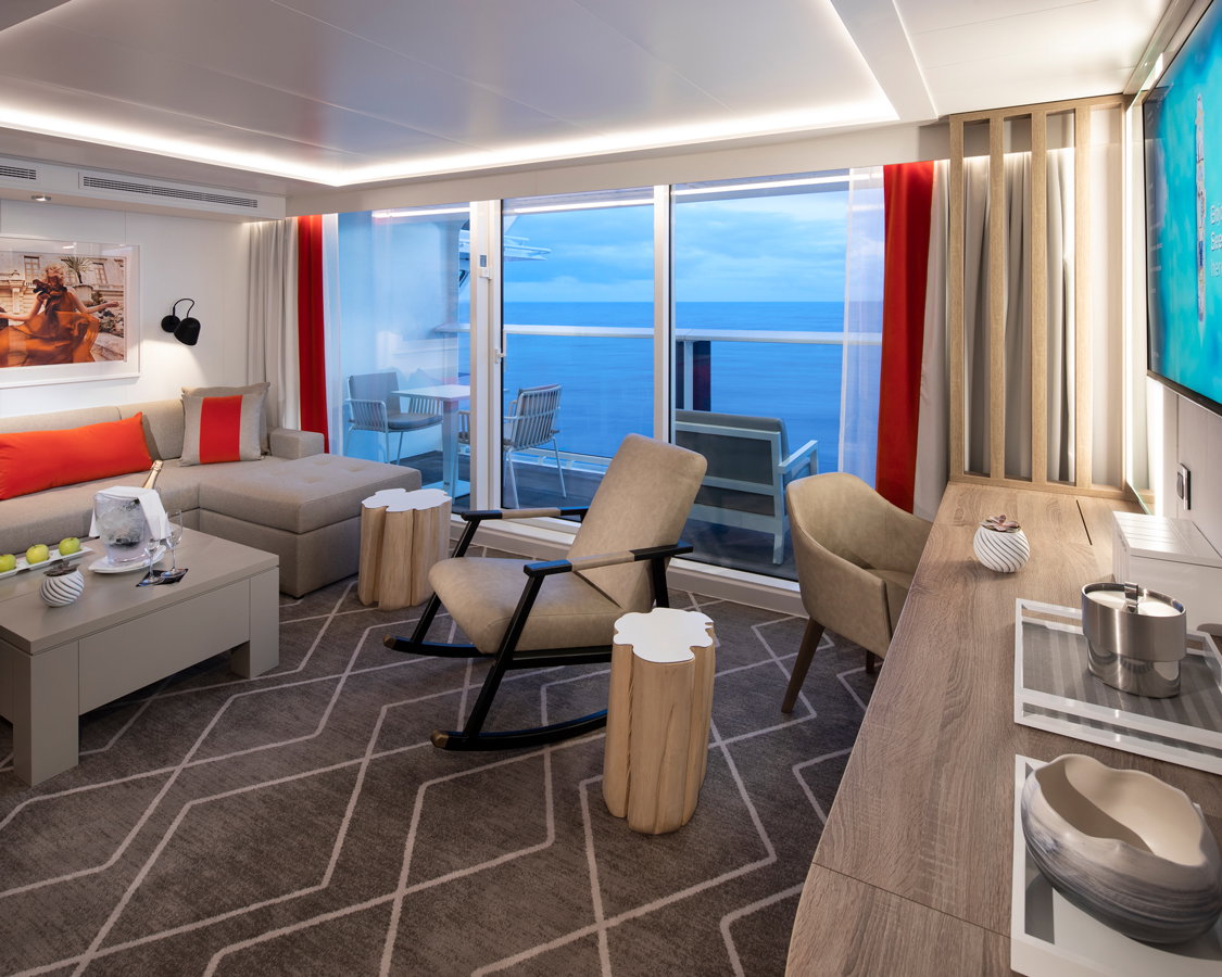 • Infinite Veranda : cabine unde balconul și camera devin un singur spațiu panoramic, cu ferestre mari spre mare. • AquaClass® & Concierge Class : cabine cu facilități extra și acces la restaurante exclusive. • Suite & Iconic Suites : suite spațioase cu vedere panoramică și servicii premium, inclusiv în unele cazuri butler și facilități de top.