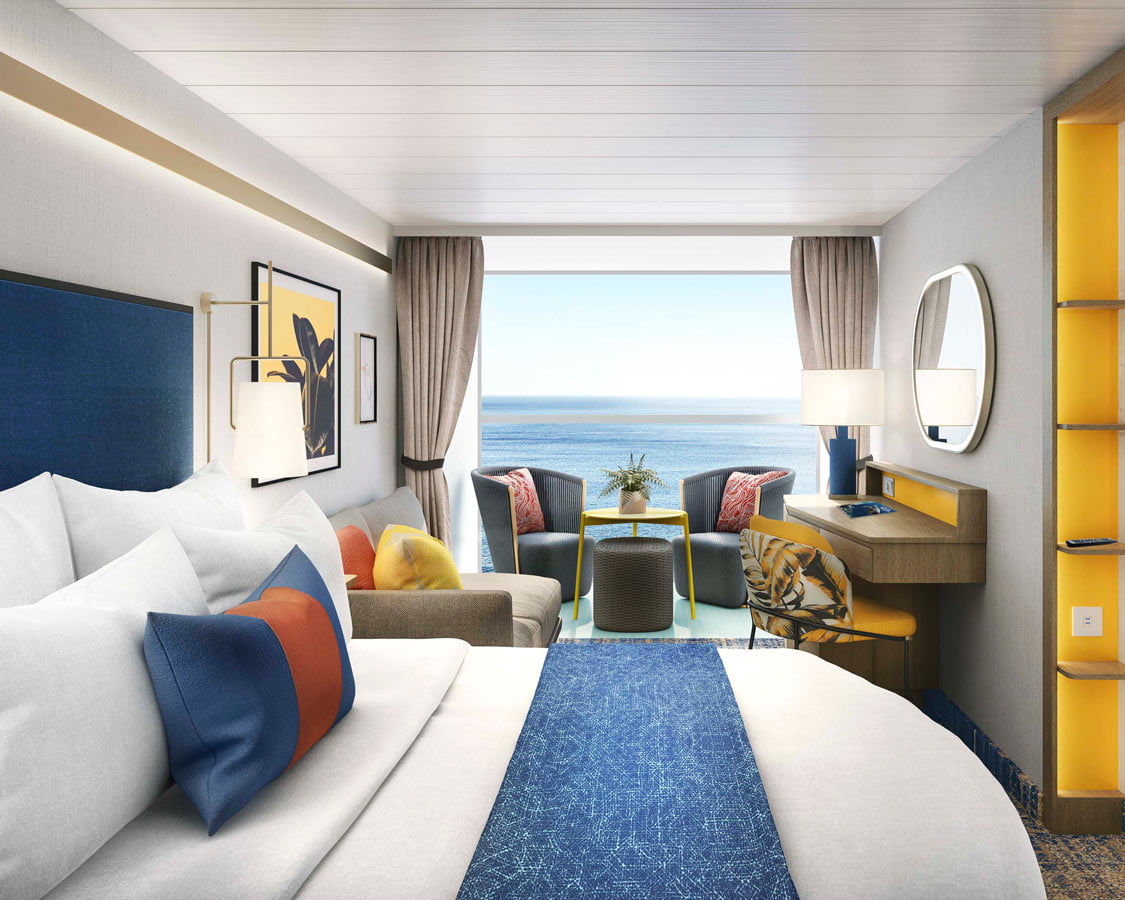 Cabinele și suitele sunt foarte variate, de la cabina interioară la suite spațioase cu vedere panoramică și balcon. Printre opțiuni se numără: • Infinite Balcony – cabine cu balcon „francez” cu geamuri panoramice. • Surfside Family Suite și Ultimate Family Townhouse – soluții moderne pentru familii, cu spații separate pentru copii și facilități tematice. • Icon Loft Suite și alte suite premium cu terase spațioase.