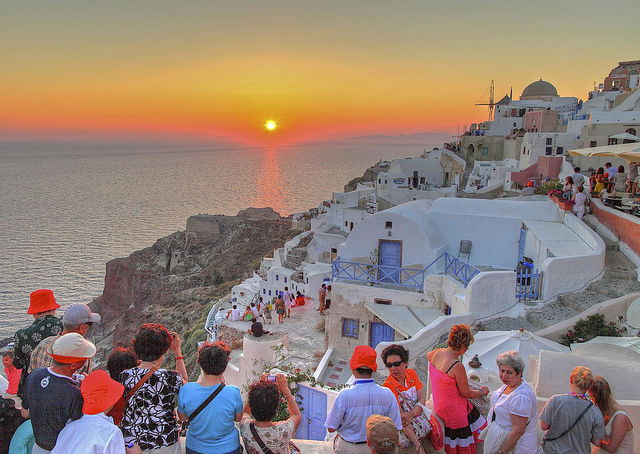 Culorile apusului se reflectă pe casele albe și pe cupolele albastre, creând un peisaj ireal. Atmosfera romantică este completată de străduțele înguste, tavernele cochete și mulțimea de oameni care așteaptă în liniște momentul magic. Priveliștea include și marea presărată cu bărci și catamarane care se aliniază pentru a prinde spectacolul soarelui.