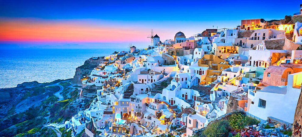 Santorini este una dintre cele mai spectaculoase și romantice insule ale Greciei, parte a arhipelagului Ciclade, renumită pentru peisajele sale unice create de erupțiile vulcanice. Insula are forma unui semicerc în jurul unei impresionante lagune (caldera), oferind priveliști dramatice asupra mării Egee și a apusurilor care au făcut-o celebră în întreaga lume.