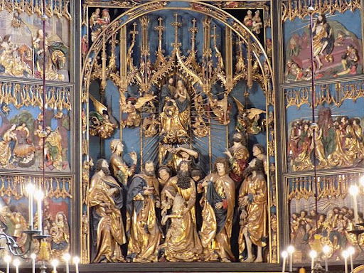 Cel mai faimos element al bazilicii este altarul gotic sculptat de Veit Stoss, un adevărat capodoperă a artei medievale, cu detalii extrem de fine care descriu scene biblice pline de dramatism și expresivitate. Interiorul bisericii este decorat cu vitralii colorate și fresce care creează o atmosferă solemnă și impresionantă.