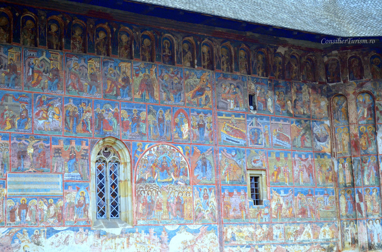 Admiră frescele exterioare și studiază scenele Bibliei: Judecata de Apoi, Arborele lui Iesei, Scara virtuților.