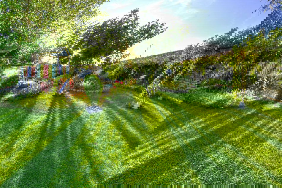 Zonă de luat masa în aer liber: În grădină există o zonă amenajată pentru servirea mesei în aer liber, ideală pentru mic dejunuri sau cine relaxante.