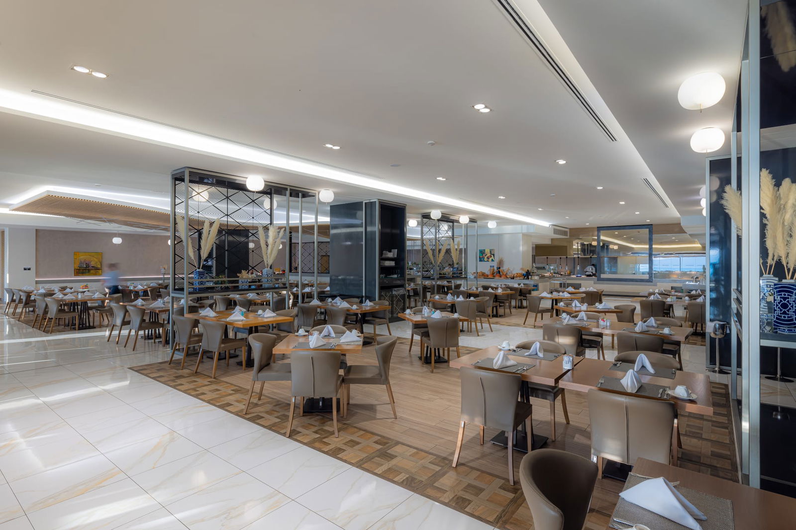In ceea ce priveste mesele, hotelul ofera o varietate de optiuni culinare, de la preparate traditionale grecesti la specialitati internationale, toate pregatite cu ingrediente proaspete si locale. Oaspetii pot savura mesele in restaurantele tematice, fiecare avand un concept unic, care reflecta cultura gastronomica a regiunii.