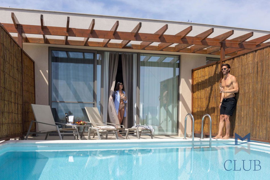 Camerele si suitele sunt dotate cu facilitati moderne, asigurand confortul necesar pentru o sedere placuta. Fiecare camera ofera vederi spectaculoase asupra marii Egee, permitand oaspetilor sa se bucure de frumusetea naturala a zonei. Atmosfera relaxanta si serviciile de inalta calitate contribuie la crearea unei experiente de neuitat.