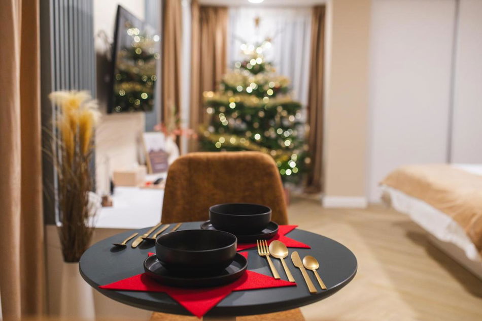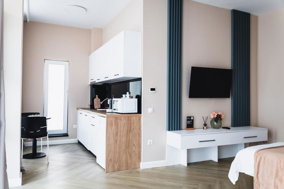 Fiecare unitate de cazare este dotata cu o bucatarie complet utilata, inclusiv masa, TV cu ecran plat si canale prin cablu. Baia privata este echipata cu cabina de dus, papuci si uscator de par, asigurand confortul necesar. De asemenea, oaspetii pot beneficia de un cuptor cu microunde, frigider, plita si aparat de cafea, facilitand pregatirea meselor in intimitatea apartamentului.