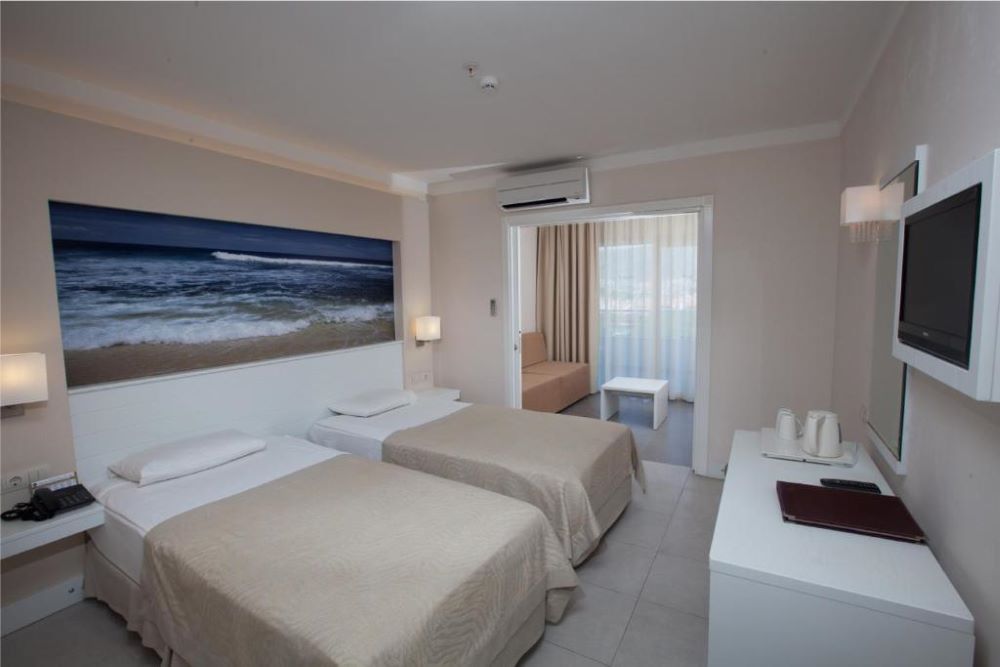 Camerele hotelului sunt dotate cu toate facilitatile necesare pentru un sejur placut. Acestea includ 156 de camere standard, 16 apartamente, 24 camere pe colt si 6 family room, fiecare avand vedere la munte sau la mare. Camerele sunt echipate cu baie cu cada sau dus, uscator de par, TV satelit, telefon direct, seif (cu plata), mini bar (cu plata), aer conditionat individual si balcon. Decorul este modern, cu mocheta sau gresie, oferind un ambient placut si relaxant.