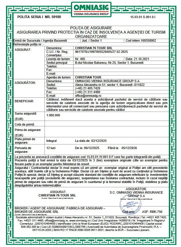 Agentia de turism organizatoare Christian Tour are polita de asigurare pentru caz de insolvabilitate, Seria I nr. 59100 emisa in data 03.12.2025 valabila pana la data de 05.12.2026 emisa de catre Societatea de Asigurare-Omniasig Vienna Insurance Group S.A cu sediul in str. Aleea Alexandru nr 51, sector 1, Bucuresti.